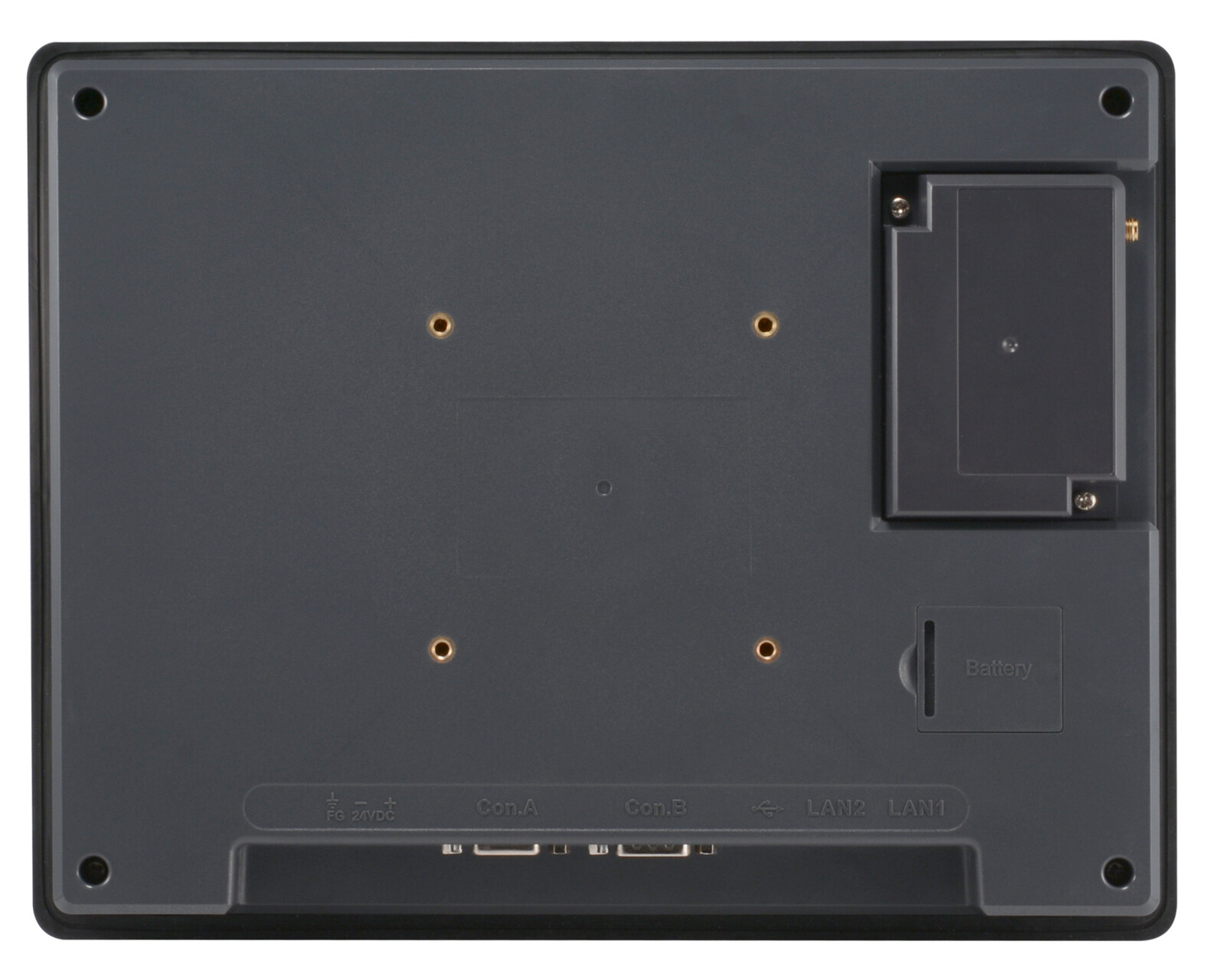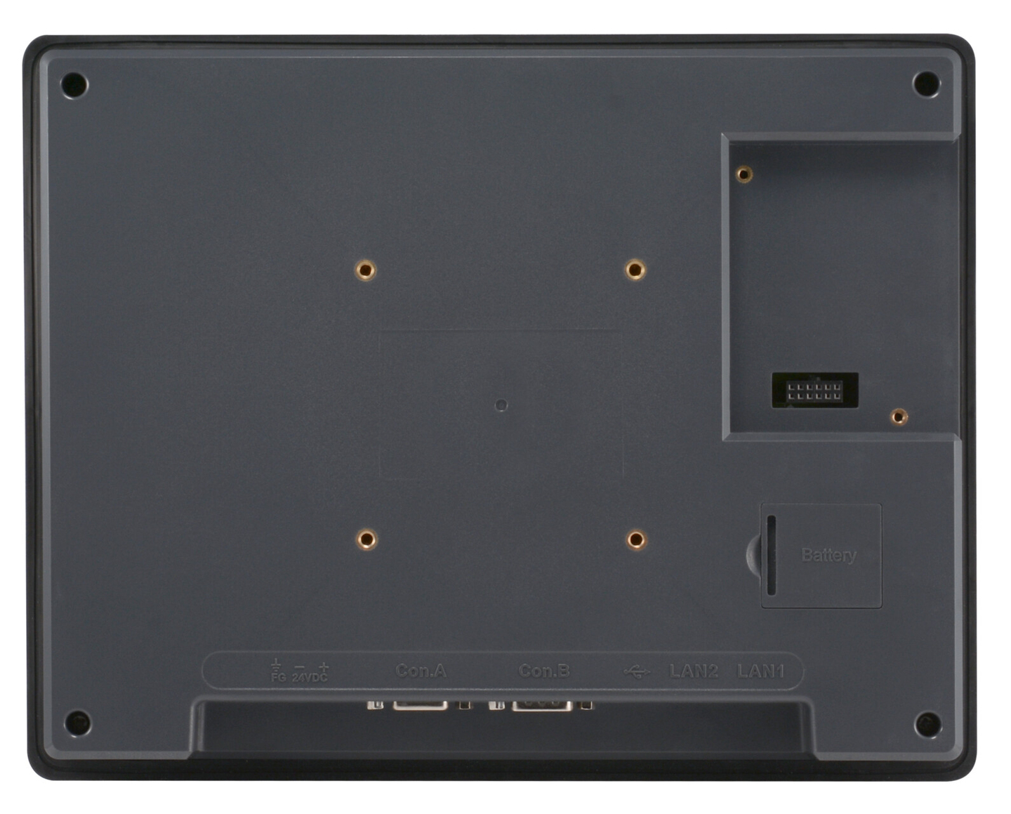 Category Specification Display 10.1" WVA LCD, 1024 × 600 resolution, 350 cd/m² brightness, 1000:1 contrast ratio, LED backlight (>50,000 hrs), 16.7M colors, 89° viewing angle (T/B/L/R), Pixel pitch 0.2175 × 0.2088 mm Touch Panel 4-wire resistive type, ±2% accuracy Memory 4 GB flash, 1 GB RAM Processor Quad-core RISC I/O Ports No SD card slot, USB 2.0 Host × 1, Ethernet LAN 1 (10/100/1000), LAN 2 (10/100), COM Ports: Con.A – COM2 RS-485 2W/4W, COM3 RS-485 2W; Con.B – COM1 RS-232 4W, COM3 RS-232 2W RS-485 Dual Isolation N/A Audio Output N/A RTC Built-in Power 24 VDC ±20%, Built-in power isolation, 1 A @ 24 VDC, 500 VAC voltage resistance (1 min), Isolation resistance >50 MΩ at 500 VDC Enclosure Plastic, PCB coating Dimensions (W×H×D) 271 × 213 × 38 mm Panel Cutout 260 × 202 mm Weight Approx. 1.2 kg Mounting Panel mount, VESA 75 × 75 mm Protection NEMA4 / IP66 / UL Type 4X (indoor) front panel Operating Temp. 0° to 50 °C Storage Temp. -20° to 60 °C Humidity 10% to 90% (non-condensing) Altitude Up to 3,000 m Vibration 10–25 Hz (X, Y, Z, 2G, 30 min) Certifications CE marked, cULus listed Software Weincloud EasyAccess 2.0 (Optional), Dashboard (Optional)